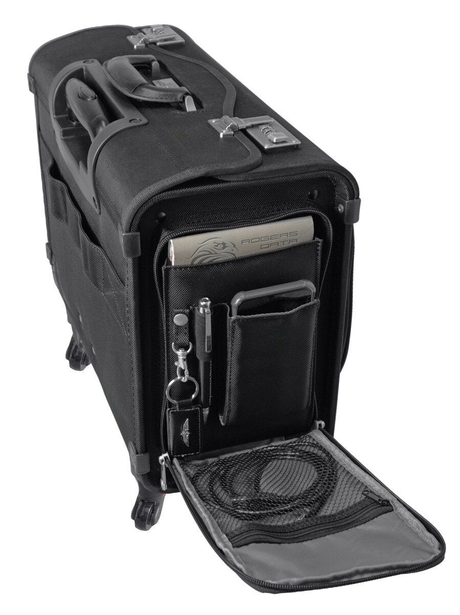 There are two outer side pockets that can be used for storage, also penholders and a removable key holder. Above the left pocket there is a name plate, so that the pilot case can be identified and returned to its owner if lost.